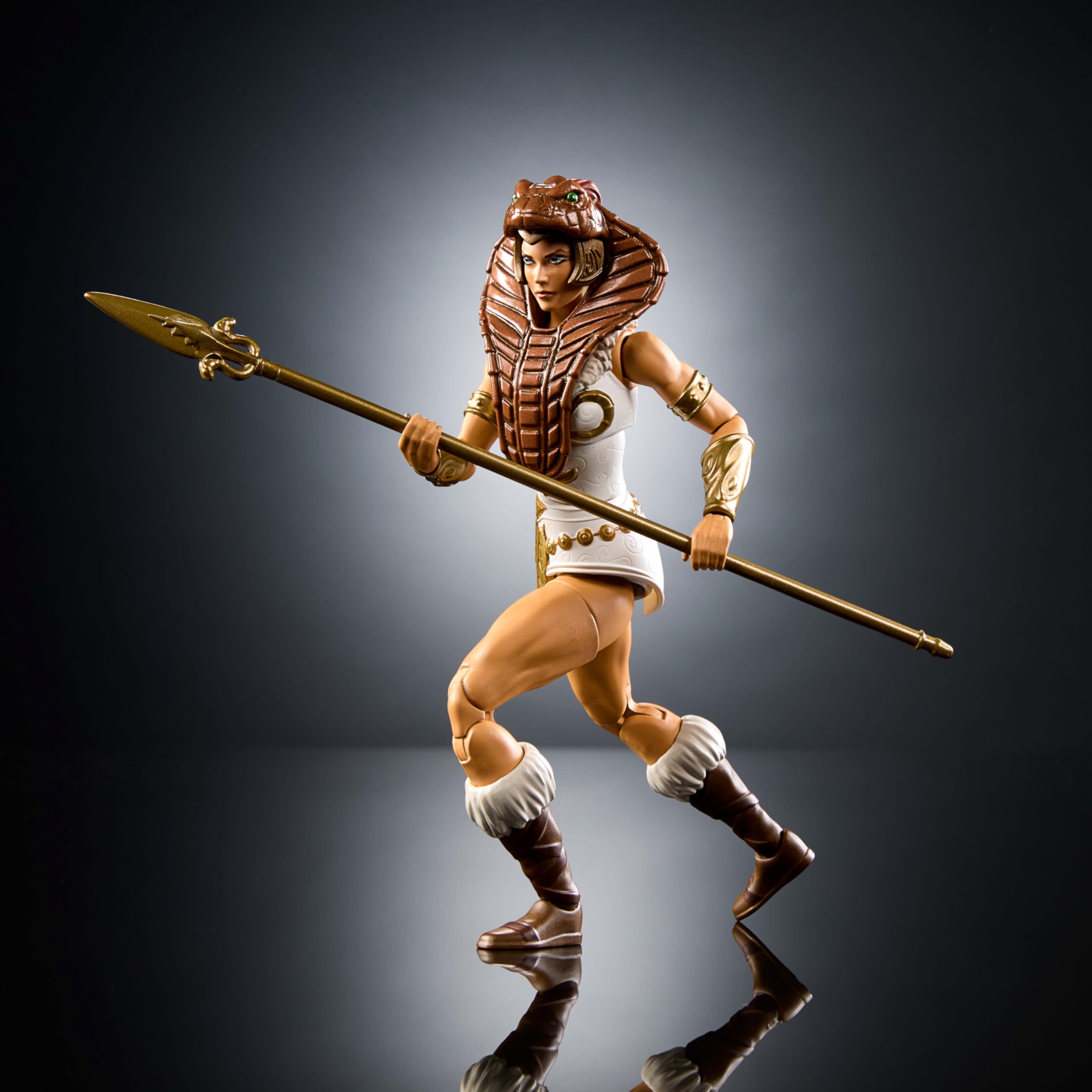 - The figure comes with an armored cobra hood, which is removable, a Mark Taylor-inspired spear, a serpent-headed staff, a shield and an extra set of hands.